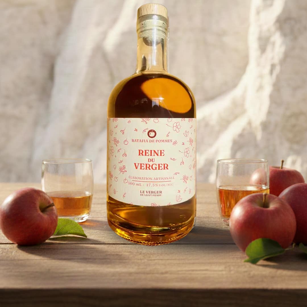 La Reine du Verger, notre ratafia de pommes, incarne la rencontre entre notre héritage arboricole et notre passion pour l’innovation. Ce ratafia d’exception naît d’une récolte manuelle minutieuse et d’une élaboration artisanale contemporaine. Sa texture onctueuse et son caractère minéral révèlent toute la richesse de nos fruits, offrant une expérience gustative unique aux amateurs de spiritueux subtils et raffinés.